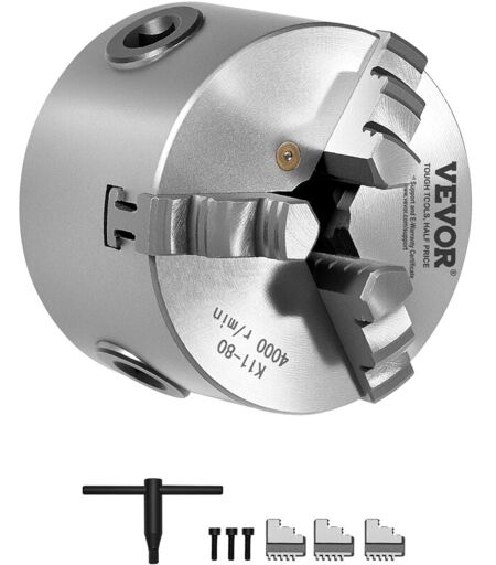 VEVOR Mandrin de Tour a 3 Machoires, 80 mm, Mandrin Auto-centrage Mors Reversibles, en Fonte HT300, Plage de Serrage 2-63 mm, avec Cle en t, Serrage