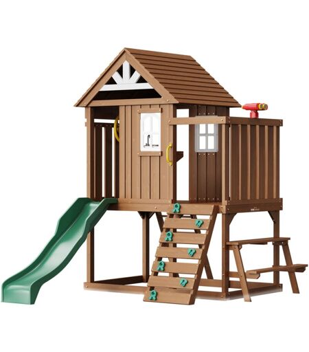 Cabane de jeux extérieure en bois Cette maisonnette en bois est spécialement conçue pour les enfants de 2 à 10 ans. Elle offre un espace de divertissement spacieux pouvant accueillir plusieurs enfants à la fois, stimulant ainsi une imagination sans limite. Elle comprend une aire de jeux multifonctionnelle avec une échelle d'escalade, un toboggan et un mur d'escalade, encourageant le courage et la sagesse chez les enfants. La table de pique-nique et les chaises favorisent l'amitié et le partage pendant les récréations. De plus, elle est livrée avec une variété d'accessoires amusants : un télescope pour explorer l'inconnu, un jouet de cuisinière et d'évier simulé et un ensemble d'ustensiles de cuisine, transformant les enfants en petits chefs pour découvrir la joie de vivre. Fabriqué en bois de cèdre naturel, il est écologique et durable, avec un traitement de peinture à base d'eau pour l'extérieur qui assure une protection même les jours de pluie. Espace de divertissement spacieux ...
