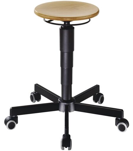 Tabouret de travail pivotant à hauteur réglable par vérin à gaz, anneau de réglage, assise en contreplaqué de hêtre, roulettes. Produit livré = démonté. Matériau assise = contreplaqué de hêtre. Modèle de piétement = avec roulettes. Matériau du piétement = acier. Coloris du piétement = noir. Type de réglage en hauteur = vérin pneumatique avec anneau de réglage. Coloris assise = bois. Hauteur assise = 400 - 530 mm. Diamètre assise = 340 mm. Type d'assise = assise ronde. Charge max. = 120 kg. Propriété = lavable, robuste. Type de produit = tabourets. Ø assise 340 mm. Réglage de la hauteur par anneau sous l'assise. Piétement à cinq branches en acier. Cette chaise pratique dispose d'une assise en contreplaqué de hêtre de haute qualité , qui apporte un aspect naturel et chaleureux à votre environnement de travail. Avec un diamètre d'assise de 340 mm , l'assise ronde offre suffisamment de place et de confort pour de multiples domaines d'application. Le mécanisme de réglage de la hauteur au ...