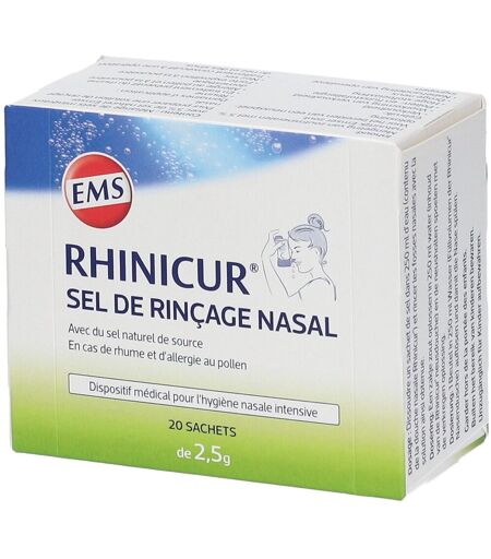 Rhinicur Sel de Rinçage NasalSel de rinçage nasal multiminéral Rhinicur®Un remède naturel contre l’écoulement nasal, les poussières et les allergies : le sel de rinçage nasal multiminéral Rhinicur® est particulièrement bien toléré et convient également à un traitement prolongé. Pour des soins tout en douceur des voies respiratoires – sans aucun risque d’accoutumance. La douche nasale Rhinicur® et le sel de rinçage nasal multiminéral Rhinicur® forment une équipe de choc en cas d’affections des voies respiratoires supérieures, par exemple en cas d’allergie aux pollens ou de rhinite. Ainsi vos voies respiratoires sont à nouveau rapidement libérées. Pour adultes et enfants à partir de 3 ans. AvantagesLe mélange délicat de sels minéraux Rhinicur® est spécialement adapté aux besoins de la muqueuse nasaleLe sel de source naturel contient plus de 20 minéraux et oligo-éléments. En comparaison avec le sel de cuisine ou le sel marin, lesquels conviennent uniquement à un nettoyage de base, le Sel de Rinçage Nasal Multiminéral Rhinicur contient en outre : De l’hydrogénocarbonate de sodium : permet de dissoudre les sécrétions nasales visqueuses et tenaces, ainsi que de neutraliser les métabolites inflammatoires. Du sulfate de potassium : favorise le décongestionnement des muqueuses et améliore le flux sanguin. Du sel de source naturel : contribue à reminéraliser et à revitaliser les muqueuses nasales. Sans effet de dépendance : grâce à sa composition particulièrement bien tolérée, le sel convient également à un usage prolongé.IndicationDomaines d’application : en cas de rhumes fréquents en traitement préventif du rhume en cas de sécheresse nasale et de croûtes dures en cas de forte exposition à la poussière et aux saletés allergie au pollen et à la poussière domestique en cas d’inflammations du nez et des sinus selon les conclusions du médecin traitement consécutif à une opération du nez et des sinus selon l’avis du médecin. ApplicationPour préparer une solution de rinçage nasal, faites dissoudre contenu d‘un sachet de sel de rinçage nasal RHINICUR® dans 250 ml d’eau tiède. La douche nasale RHINICUR® a une contenance de 250 ml. Veuillez utiliser de l’eau à une température maximale de 37°C. Veillez à dissoudre complétement le sel en agitant vigoureusement ou faisant tourner le récipient, car si le sel n’est pas complètement dissous, cela peut provoquer des signes d’irritation tels que des brûlures ou picotements. Le rinçage nasal peut être effectué jusqu’à 3 fois par jour, avec à chaque fois une solution de 250 ml. Habituellement, la fréquence recommandée est d’1 fois par jour. Dans le cadre de traitements de rinçage de longue durée, selon avis médical (plusieurs mois et années), une utilisation tous les 2 à 3 jours a également fait ses preuves.Effets secondairesDans de très rares cas, l’application peut conduire à des picotements légers dans le nez, comme des démangeaisons et des brûlures. Dans certains cas, il est possible que du liquide s’écoule dans la... ...