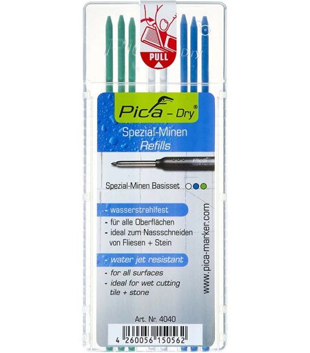 Set de 8 mines pour crayon PICA DRY 3030 Set de base 3 couleurs : 3 x Mines vertes 2 x Mines blanches 3 x Mines Bleues Référence : 4040 Marque sur toutes surfaces. ...