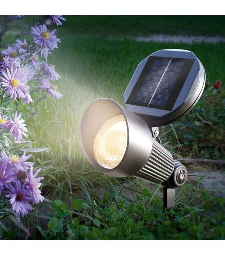 Scène sombre, rideau, lumière ! Le spot LED solaire Un jardin aménagé avec amour ne doit pas seulement attirer tous les regards pendant la journée, mais aussi se présenter sous son meilleur jour la nuit. Pour cela, le spot LED solaire illumine certains éléments de votre concept global avec la lumière claire d'une LED Nichia et crée ainsi une nouvelle interprétation nocturne de votre aménagement de jardin. Vous avez le choix entre une version du spot en lumière blanche froide, qui éclaire les endroits sombres, ou une lumière blanche chaude plus discrète. Au sol ou au murPossibilités de montage flexibles Grâce au piquet de terre et au support de montage mural fournis, vous avez toutes les possibilités de choisir l'endroit où vous souhaitez utiliser la lumière du spot. Vous pouvez soit placer des accents lumineux sur des buissons, des arbustes ou des éléments de décoration depuis le sol, soit éclairer votre terrasse ou votre coin salon depuis le haut. L'inclinaison du projecteur peut ...