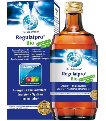 Regulatpro Bio est une préparation liquide fermentée, élaborée à partir de fruits frais, de noix et de légumes avec de la vitamine C naturelle. Ce produit soutient le système immunitaire et le métabolisme énergétique grâce à son procédé unique de fermentation en cascade. Regulatpro Bio est également vegan et certifié biologique, garantissant ainsi des ingrédients de haute qualité et une efficacité optimale.IngrédientsEau, citron*, figue*, datte*, NOIX*, NOIX de coco*, glycérine (origine végétale), extrait d'acérola* (17% Vit. C), CÉLERI*, germes de blé*, artichaut*, pois*, millet*, épices*, curcuma*, safran*. *ingrédients issus de l'agriculture biologiqueAllergènes : Gluten, Fruits à coques, Céleri.Valeurs nutritionnellesValeurs nutritionnelles moyennespar 100 ml%Dose journalière = 2 x 10 ml%Valeur énergétique kJ/kcal92,4 / 21,41,118,5 / 4,30,2Glucides5,1 g2,01,02 g0,4- dont sucre0,3 g0,30,06 g0,1Protéines0,3 g0,60,06 g0,1Sel0,025 g0,40,01 g0,1Vitamine C61,25 mg76,5**12,25 mg15,3**** % en dose journalière recommandée selon Directive EDI 817.022.16* % en apport de référence pour un adulte-typeConseils d'utilisationMatin et soir, prendre 10 ml de Regulatpro Bio (mesuré avec le bouchon doseur) non dilué, maintenir en bouche pendant une minute avant d'avaler. En cas de sensibilité à l'estomac, diluer dans un verre d'eau.Précautions d'emploiConserver au frais, au sec et à l'abri de la lumière. Bien agiter avant utilisation. La quantité journalière recommandée indiquée ne doit pas être dépassée.Poids net350 mlAdresse du FabricantDr. Niedermaier Pharma GmbHAbt. Lebensmittel86682 HohenbrunnDeutschland ...