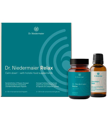 Concept global en 2 phases composé d'un concentré fermenté (Regulatpro Duo) et de capsules de complexes nutritifs. Le compagnon idéal sur la voie d'un plus grand calme intérieur et d'une plus grande sérénité, pour un équilibre du corps et de l'esprit. ¹ La vitamine C et la riboflavine contribuent à protéger les cellules contre le stress oxydatif. La niacine contribue à une fonction psychique normale. L'acide pantothénique contribue à une synthèse et à un métabolisme normaux des hormones stéroïdes, de la vitamine D et de certains neurotransmetteurs. L'acide pantothénique contribue à des performances intellectuelles normales. Ce coffret contient : 6 x Regulatpro, 50 ml1 x Relax, 60 capsules Utilisation : Regulatpro Duo : le matin, prendre 10 ml de Regulatpro Duo dilués dans de l'eau. Gélules de Dr. Niedermaier Relax : Prendre le matin 2 gélules de Dr. Niedermaier Focus avec Regulatpro Duo dans de l'eau. La quantité journalière recommandée indiquée ne doit pas être dépassée. Ne pas utiliser comme substitut d'une alimentation équilibrée et variée ainsi que d'un mode de vie sain, qui sont importants pour la santé. Conserver hors de la portée des jeunes enfants. Ne pas stocker à plus de 25 °C. Agiter Regulatpro Duo avant utilisation. Conserver au frais après ouverture. L'utilisation d'ingrédients frais peut entraîner des variations d'odeur, de couleur, de goût et de turbidité. Sans ajout de colorants ni de conservateurs. Sans sucre et sans gluten. ...