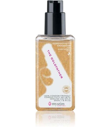 Le Lubrifiant Conducteur Doré The Goldfather de la marque Mystim fera office de lubrifiant à utiliser pour vos rapports sexuels ou avec des sextoys mais garantira surtout une conductivité électrique exceptionnelle lors d'une séance électrostimulation. The Goldfather est recommandé par la marque Mystim pour une utilisation avec ses sextoys E-Stim et ses coffrets d'électrostimulation. En effet, en plus d'être un lubrifiant à base d'eau, The Goldfather est aussi un gel conducteur pour l'électrostimulation grâce aux copeaux d'or disséminés dans sa solution. L'or pur 23 carats contenu dans le flacon donne donc un effet scintillant lors de l'application du produit sur votre corps et possède aussi une fonction conductrice. Le Lubrifiant Conducteur Doré The Goldfather est tout à fait compatible avec les préservatifs. Son flacon est équipé d'une pompe pour un dosage plus précis et plus propre. Testé dermatologiquement. ...