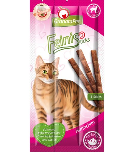 Les bâtonnets GranataPet Feini Sticks au poulet sont de délicieuses friandises pour votre petit félin. Leur recette à base de poulet digeste et de foie au goût prononcé leur confère une saveur irrésistible, et fait l'unanimité auprès des chats. Ce... ...