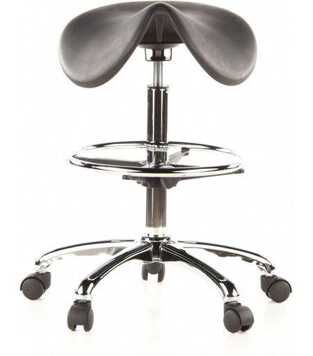 ... POUR QUE VOUS SOYEZ BIEN EN SELLE! Le design de ce siège extravagant est inspiré par une selle. Laissez-vous convaincre par le sentiment d'assise de ce siège en forme de selle. Tabouret en forme de selle ergonomique Mousse polyuréthane antidérapante Repose-pieds confortable, réglable en hauteur Hauteur de l'assise ajustable Piètement croisé en acier chromé de grande qualité Equipé des roulettes auto-freinantes pour moquette. Grace à lesquelles le mouvement du fauteuil est possible seulement durant son utilisation. Si l'utilisateur se lève, le mécanisme de freinage des roulettes s'engage automatiquement pour éviter un mouvement involontaire du fauteuil. Dès que l'utilisateur s'assoit, le mécanisme de freinage se débloque et le mouvement du fauteuil est de nouveau possible. Livré avec roulettes et patins (l'utilisation des patins est recommandée en raison de la hauteur de l'assise) Cet article est livré en pièces détachées Le montage en quelques étapes simples doit être fait par le client. Pour les ressorts à gaz, les roulettes de chaise, les pieds etc. il va de soi qu'aucun montage n'est nécessaire. Fabricant: hjh OFFICE Référence: 100% polyuréthane Couleur: Noir Information accoudoir: sans accoudoirs Hauteur d'assise: 60 cm Hauteur d'assise à : 85 cm largeur d'assise: 46 cm Informations sur les roulettes: roulettes 11mm X 50mm pour moquette compris Etat: Sortant d'usine, emballage d'origine Garantie: 24 mois ...
