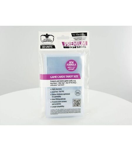 Pack de 50 pochettes Ultimate Guard Premium Soft Sleeves jeu de Tarot. Pack de 50 pochettes Ultimate Guard Premium Soft Sleeves jeu de Tarot. Pack de 50 pochettes haute qualité pour stocker et protéger vos cartes de jeu de Tarot et vos cartes de jeux de plateau Blue Moon, Elder Sign, War Of The Ring, Infiltration et plus encore. - Très haute clarté - Sans acide Sans PVC - Taille optimale - Evite les coins cornés et les rayures - Epaisseur de pochette optimisée pour la jouabilité - Durée de vie prolongée - Taille des pochettes: 73 x 122 mm ...