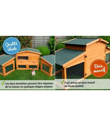 Description générale Le clapier à lapins en bois de pin de haute qualité, modèle Étable du Roi, offre un espace généreux et sécurisé pour vos animaux. Sa conception astucieuse permet une séparation facile en trois éléments pour un nettoyage simplifié ou un déplacement. Avec un accès aisé grâce à ses 6 portes, ce clapier assure le confort et la protection de vos rongeurs. Spécifications techniques Dimensions extérieures : 180 x 62 x 72 cm (L x P x H) Matériau : Bois de pin traité Toit : Recouvert de bitume pour une protection contre l'humidité Fil galvanisé tout autour Grand tiroir à fumier pour un nettoyage facile Compatibilité et accessoires Convient aux espèces suivantes : chinchilla, furet, lapin, lièvre, cochon d'Inde, tamia Éléments séparables pour la flexibilité d'utilisation Installation Le clapier est conçu pour être facilement assemblé et démonté grâce à ses crochets. Assurez-vous de le placer dans un endroit sécurisé et à l'abri des intempéries. Utilisation Ce clapier permet ...
