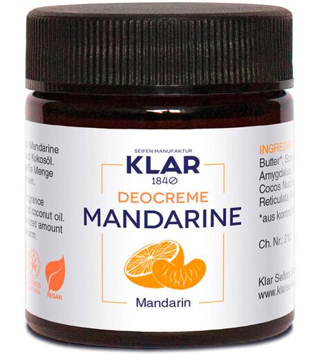 La crème déodorante à la mandarine Klar's dégage un parfum fruité et sucré et soigne la peau sensible des aisselles avec du beurre de karité, de l'huile d'amande et de l'huile de coco. La crème déodorante protège de manière fiable toute la journée grâce aux ingrédients naturels que sont le bicarbonate de soude et le zinc ainsi que l'huile essentielle de mandarine. Les sels d'aluminium, l'huile de palme et l'alcool sont absents ! Nous avons délibérément renoncé à ces ingrédients. Ainsi, la crème déodorante Klar's peut également être utilisée directement après le rasage. Application : appliquer une quantité de crème déodorante de la taille d'un petit pois sous les aisselles fraîchement lavées et frotter. Klar's Deocreme protège ainsi toute la journée. ...