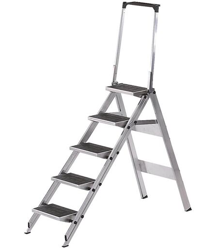 Escabeau pliant en alu, marches en alu revêtues de PVC, avec garde-corps, 5 marches. Produit livré = monté. Type de produit = escabeaux pliants en aluminium. Profondeur marches = 230 mm. Largeur marches = 360 mm. Propriété = repliable. Profondeur replié = 120 mm. Accès = 1 côté. Nombre marches, plate-forme comprise = 5 pces. Hauteur plate-forme = 1150 mm. Matériau du piétement = aluminium. Matériau marches = tôle aluminium avec revêtement PVC. Coloris du piétement = argent. Poids = 13.7 kg. Hauteur de travail = 3150 mm. Version = avec barre de poussée. Marches en tôle d'aluminium revêtues de PVC antidérapant et esthétique. Confortables et sûrs. Montants doubles en aluminium. Articulations renforcées robustes. Marches arrondies extra-larges, 360 x 230 mm. Stabilité assurée par sabots striés grand format. Faible encombrement repliés (120 mm seulement). À partir de 4 marches, disponible uniquement avec garde-corps. ...