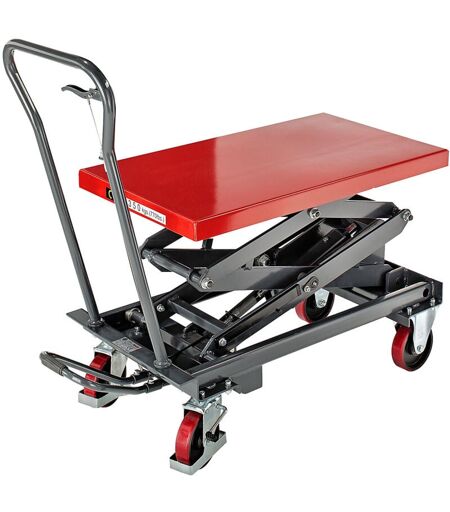 Chariot à plate-forme élévatrice, plage de levée 435 - 1500 mm, force 350 kg. Produit livré = en partie démonté. Charge max. = 350 kg. Plage de levée = 435 - 1500 mm. Matériau des roues = polyuréthane. Propriété = mobile, manuel. Longueur plate-forme = 920 mm. Largeur plate-forme = 520 mm. Longueur = 1170 mm. Largeur = 520 mm. Matériau plate-forme = acier, peint époxy. Coloris plate-forme = rouge sécurité RAL 3001. Levée par coup de pédale = 15.2 mm. Coloris du piétement = gris basalte RAL 7012. Matériau du piétement = acier, peint époxy. Coups de pédale jusqu'à levée max. = 70 pces. Commande de levée = hydraulique par pédale. Type de produit = chariots à plate-forme élévatrice. Train de roulement = 2 roulettes pivotantes avec chasse-pieds et dispositif de blocage, 2 roulettes fixes. Diamètre roues = 150 mm. Avec doubles ciseaux. Appareils standards qui ont fait leurs preuves. Pour lever, abaisser et transporter les charges. Travail ergonomique à hauteur de travail adéquate. Levée ...