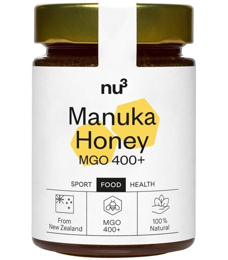 Il est important d'avoir une alimentation variée et équilibrée et un mode de vie sain.nu3 Miel de manuka MGO 400+L'arbuste de manuka (également appelé myrte des mers du Sud) ne se trouve que dans le sud-est de l'Australie et en Nouvelle-Zélande. Le miel utilisé pour le manuka nu3 est extrait du nectar de l'arbuste par les abeilles en Nouvelle-Zélande. Celui-ci est récolté dans la ruche et délicatement centrifugé à froid. Il est ensuite filtré afin d'éliminer les résidus de cire et autres particules. Sans aucun additif, le miel de manuka brut est mis en bouteille.Ce qui est décisif pour la qualité du miel de manuka, c'est avant tout sa teneur en MGO. Le méthylglyoxal, ou MGO, est la substance caractéristique du miel de manuka et se forme lors du séchage du nectar dans les rayons de miel. Les fleurs du buisson de manuka contiennent une substance, la dihydroxyacétone, qui est transformée en MGO au cours de ce processus. Le miel de manuka nu3 contient au moins 400 mg de méthylglyoxal par kg de miel, ce qui est régulièrement contrôlé par des laboratoires indépendants.Vous pouvez utiliser le miel de manuka comme du miel ordinaire dans du thé, comme pâte à tartiner ou pour agrémenter des desserts. Ou dégustez-le pur : laissez fondre 1 à 2 cuillères à café sur votre langue chaque jour. Composition:Miel de manuka (Nouvelle-Zélande)Valeur nutritionelle: Pour 100 gÉnergie1450 kJ/346,56 kcalGraisse<1 gDont acides gras saturés-Glucides80 gDont sucre80 gFibres0 gProtéine<1 gSel0 g Conseil d'utilisation: Pur : pendant la journée, prendre 1 à 3 cuillères de miel de Manuka et laisser fondre dans la bouche. Vous pouvez aussi l'incorporer dans du thé, l'utiliser comme de la pâte à tartiner ou pour la cuisson.Précautions d'emploi:À conserver dans un endroit sec, frais et sombre. Poids net: 250 g Fabricant:nu3Brückenstr. 510179 Berlin ...