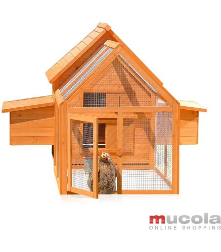 Description générale Ce poulailler bien conçu offre à vos poules un logement adapté avec des espaces de retraite et une liberté de mouvement. Les deux nichoirs situés sur le côté permettent un accès facile pour récupérer les œufs frais tout en maintenant un environnement propre pour la ponte. Il est équipé d'une entrée avec trappe et d'une porte verrouillable pour sécuriser vos animaux. Construit avec un plancher surélevé, il protège vos poules du froid et de l'humidité, idéal pour un élevage en plein air. Spécifications techniques Matériau : Bois Coloris : Naturel/brun Longueur totale : 156 cm (avec nichoirs) Hauteur totale : 112 cm Profondeur : 164 cm Facile à nettoyer grâce aux tiroirs accessibles par l'avant 2 nichoirs accessibles de l'extérieur Démontage facile avec le couvercle à charnière Divers volets, portes et tiroirs Construction de toit en bois pour une protection optimale Conçu pour un sommeil à l'abri du vent et des intempéries Compatibilité et accessoires Inclus : 1 ...