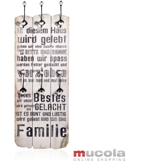 Un type particulier de panneau d'armoire La première pièce que vous remarquez lorsque vous entrez dans votre appartement est votre couloir. Raison suffisante pour investir beaucoup d'amour et de temps dans l'aménagement de l'entrée. Un couloir complet comprend naturellement aussi un porte-manteau sur lequel vous et vos invités pouvez accrocher des vestes. Avec ce modèle, vous prêtez votre salle nostalgique, mais néanmoins chic et moderne. Ce meuble en bois Paulownien est équipé de six crochets à manteaux pouvant être fixés individuellement - parfait si vous avez besoin de beaucoup d'espace ou si vous invitez fréquemment des invités chez vous. Sur la garde-robe, vous trouverez des lettres et des dictons créatifs qui vous mettront de bonne humeur. Description Dimensions : env. 100 cm x 40 cm x 3,5 cm (H x L x P) Couleur : marron/beige avec des lettres et des slogans créatifs Matériau : Paulownienholz Panneau d'armoire à l'aspect artistique Avec un lettrage accrocheur Avec 6 crochets à ...