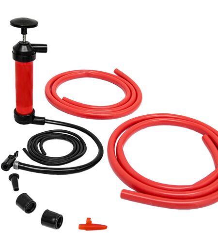Notre pompe est multi-usage et polyvalente, un accessoire indispensable tant au camping que à la maison. Non seulement peut être utilisée pour gonfler la chambre à air de la bicyclette, le matela pneumatique et la piscine gonflable des enfants, mais peut être même utilisée pour vider / transférer de liquides et de fluides (par ex. essence, carburant, eau, etc.) d'un jerrican à un autre. Dans la partie supérieure et inférieure de la pompe, il y a deux raccords différents en fonction de l'opération que vous souhaitez effectuer - gonfler ou aspirer. Incl. tuyaux et accessoires pour une utilisation immédiate. Caractéristiques du produit - Polyvalente, pour gonfler et aspirer air et liquides - Facile à utiliser - Incl. tuyaux et adaptateurs - Compact et léger, portable Informations importantes: - Hauteur: 23 cm - Largeur: 5 cm - Poids: 0,15 kg - Matière: plastique - Couleur: rouge avec des détails noirs Livraison: 1x pompe manuel 2x tuyaux pour aspirer (1,30 m) 1x tuyau pour gonfler (1m) ...
