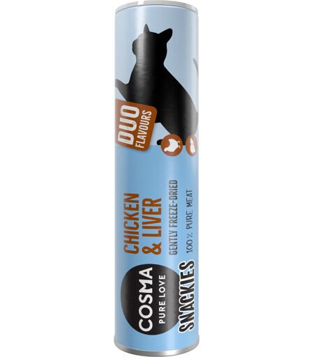 28g Cosma Snackies DUO 2 en 1 Friandises lyophilisées blanc de poulet, foie de poulet
