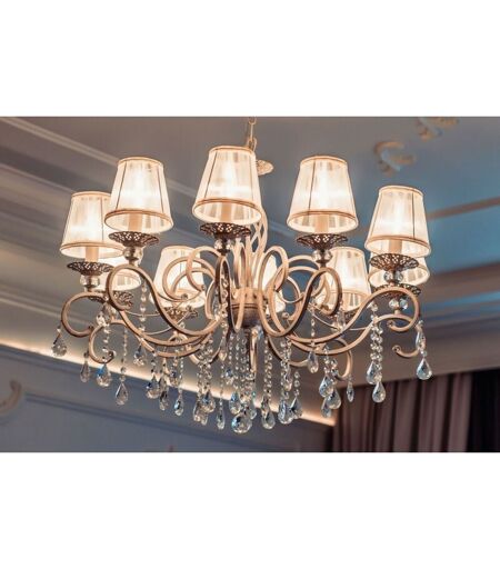 Grace Lustre blanc avec or et cristal, 10 Fini : blanc avec or Hauteur : 64 cm Hauteur maximale : 124 cm Diamètre : 85 cm Type de lampe : E14 Nombre de Classement IP : IP20 Puissance (max): 40W ...
