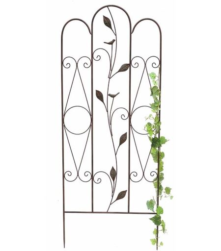 Un treillis métallique robuste pour votre jardin. Il est idéal pour les plantes grimpantes telles que les tomates, les concombres, les roses, le lierre ou la vigne. Forgé en métal, il est orné d'un motif de treillis incurvé composé de fleurs et de deux petits oiseaux en guise de décoration. Utilisez ce piquet dans votre jardin comme bordure de massif, clôture, bordure de parterre, pare-vue, clôture de jardin ou simplement comme décoration élégante. Couleur: Marron Gris, aspect vieilli Matériau: Métal Maximum de résistance: Hauteur totale 120 cm, largeur 50 cm, longueur de la flèche 20 cm, diamètre du métal: 8 mm Poids: 1,4 kg ...