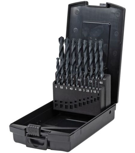 Cannelure hélicoïdale avec revêtement d'oxyde pour une évacuation rapide des copeaux, longue durée de vie grâce à la grande épaisseur d'âme et grande dureté dans la zone de travail. Laminés selon DIN 338. Queue cylindrique, courte. Coupe à droite. Acier rapide moyennement allié. Ténacité élevée. Domaines d'application : Acier allié et non allié, métaux non ferreux, fonte grise et plastique dur. Contenu de la livraison : 19 forets, 1 - 10 mm. Diamètre : 1,0 1,5 2,0 2,5 3,0 3,5 4,0 4,5 5,0 5,5 6,0 6,5 7,0 7,5 8,0 8,5 9,0 9,5 10,0 mm. Nombre de forets: 19. Fabrication: laminé. Angle de pointe: 118°. Matériau: HSS laminé. Teneur en chrome: 4%. Teneur en molybdène: 5%. Teneur en vanadium: 1,8%. Ténacité, limite de rupture: 5,5 kN/mm². Dureté: 64 - 65 HRC. Acier inoxydable: non. Acier allié: ja. Acier allié à haute résistance: non. Acier non allié: ja. Métaux non ferreux: ja. Bronze: non. Fonte grise: ja. Plastique dur: ja. Veuillez noter : Décoration non ...