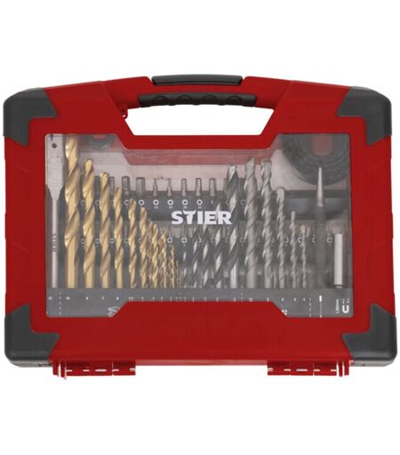 STIER Jeu de forets scies et embouts en titane, 100 pièces, 28 forets, HSS-TiN, jeu d'embouts, valise à outils, pour une multitude d'applications sur bois,