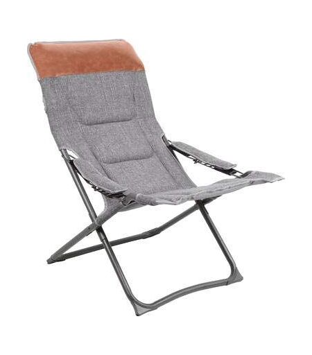 Fauteuil 3 positions Emma de Westfield. Ce fauteuil pliant et compact au style et aux couleurs Vintages, toile grise matelassée, extra-douce et appui tête en similicuir marron, sera parfait pour vous accompagner dans vos escapades camping. Le fauteuil Emma de Westfield permet de choisir entre 3 postions pour un confort et une détente optimale. Il est robuste grâce à son armature en aluminium et résistant grâce à sa toile polyester 600D de grande qualité qui est totalement imperméable, même face aux intempéries. ...