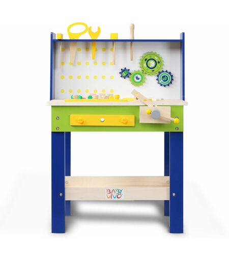 Baby Vivo Établi du Bricoleur Jouet en Bois pour Enfant - Luigi avec Engrenages rotatifs et 29 Pièces L'établi de jeu de Baby Vivo transforme la chambre d'enfant en atelier Avec l'établi de jeu, les futurs artisans âgés de 36 mois et plus peuvent découvrir le monde passionnant des clés et des équerres de menuisier. Vos enfants s'amuseront beaucoup avec lui. En même temps, ils se familiarisent avec l'utilisation des outils. Ils sont aussi actifs que créatifs avec l'établi en bois. C'est pourquoi le jouet deviendra rapidement le jouet préféré dans la chambre d'enfant. Établi pour jouer avec un équipement complet Tout ce dont les petits maîtres d'atelier ont besoin est inclus. En plus du marteau, de la scie, de la clé et autres, il y a des vis et des broches ainsi que des attaches de différentes formes pour l'assemblage. Il y a aussi un petit étau sur le plateau de l'établi de jeu. Vos enfants peuvent y serrer des pièces. Il n'y a aucun risque de blessure par des arêtes vives. Pratique : ...