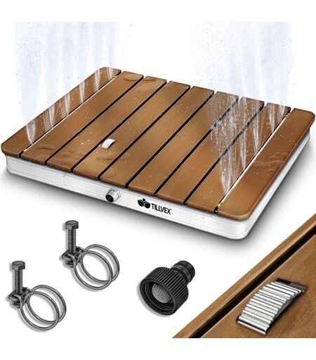 Douche de jardin d'extérieur tillvex® avec fontaine jusqu'à 4 m de hauteur Douche de sol rectangulaire et ronde avec roulette Douche d'extérieur antidérapante Douche sauna résistante aux intempéries Douche de camping en aluminium/WPC/aspect bois Profitez d'une pause rafraîchissante au jardin avec notre douche de jardin tillvex de haute qualité. Convient comme douche de piscine, douche de sauna ou douche de camping . Plongez dans le luxe absolu et détendez-vous sous une fontaine d'eau fraîche. Notre douche de sol se raccorde facilement et rapidement à un tuyau d'arrosage standard. Son installation simple permet un placement flexible où vous le souhaitez dans votre jardin. Grâce à la pédale intégrée, vous pouvez non seulement activer et désactiver les jets d'eau, mais aussi régler la hauteur de la fontaine jusqu'à 4 mètres. Notre douche d'été Tillvex vous offre une flexibilité et un confort optimaux pour une expérience de douche incomparable. Cette douche de jardin impressionne ...
