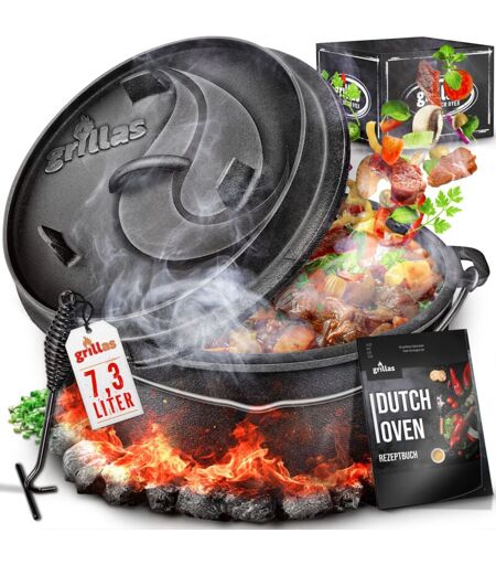 grillas Dutch Oven Set 7,3 litres - sans pied Premium Série Pré-assaisonné Casserole en fonte I Rôtissoire avec soulève-Couvercle