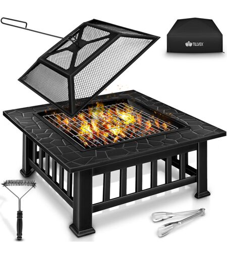 tillvex Brasero Extérieur BBQ 3 en 1 Foyer Poêle pour Jardin, Terrasse Chauffage avec Gril-le à Charbon + Couvercle Cheminée Feu pour Barbecue avec