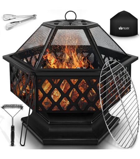 tillvex Brasero Extérieur BBQ 4 in 1 Foyer Poêle pour Jardin, Terrasse Chauffage avec Gril-Le à Charbon + Couvercle Cheminée Feu pour Barbecue avec