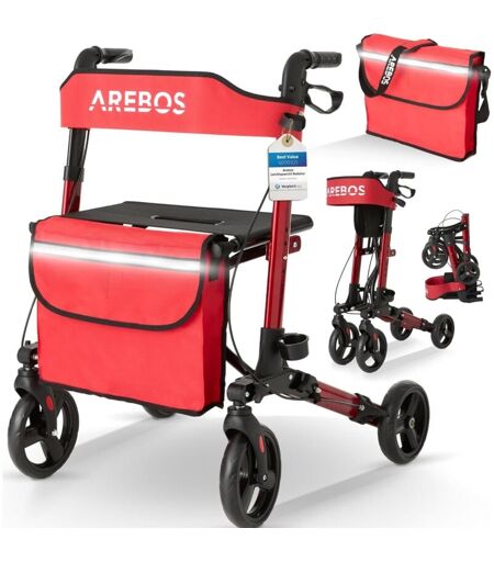 Arebos - Déambulateur Rouge 4 Roues Déambulateur Pliable/Rollator Assise et dossier/max. 136 kg Réglable en hauteur avec Sac à Provisions