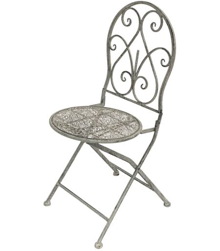 Chaise de jardin décorative en métal de style antique, parfaite pour le jardin, le balcon, la terrasse ou même votre salon. Cette chaise en fer est laquée avec des peintures de haute qualité de couleur gris-blanc et son design apporte une touche de nostalgie à votre maison. Somptueusement décorée en fer massif. Couleur: Gris Blanc Patiné. Peut supporter jusqu'à 100 kg. Pour l'extérieur et l'intérieur. Hauteur 92 cm, largeur 40 cm, hauteur d'assise 44 cm, diamètre d'assise 38 cm, hauteur de dossier 50 cm, poids 5 kg. Dimensions pliées: hauteur 100 cm, largeur 40 cm, profondeur 14 cm ...