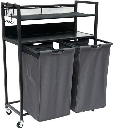 DANDIBO Panier à linge 2 compartiments avec étagères Noir Métal 96501 Collecteur de linge Chariot à linge à roulettes Panier à linge Sac à linge Moderne