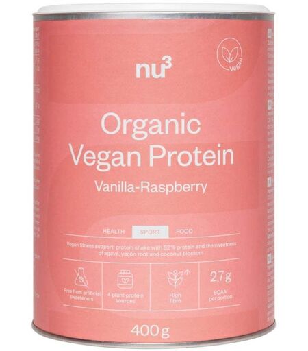 Complément alimentaire à utiliser dans le cadre d’une alimentation variée, équilibrée et d’un mode de vie sain.nu3 Bio Vegan Protein Shake Vanilla-Raspberry Dans un régime vegan, il est essentiel d’assurer un apport suffisant en protéines variées. Le shake protéiné vegan de nu3 combine des protéines de pois, tournesol, riz et chanvre, couvrant ainsi tous les acides aminés essentiels. Avec 52 % de protéines et 2,7 g de BCAA¹ par portion, il constitue une alternative idéale aux whey classiques. Composé uniquement d’ingrédients issus de l’agriculture biologique, il ne contient aucun additif superflu.Légèrement sucré grâce au sucre de fleur de coco, au sirop d’agave et de yacon, il offre une saveur agréable, sublimée par l’arôme naturel de vanille et la poudre de gousse de vanille.Pour un shake crémeux, mélangez 25 g de poudre avec 250 ml d’eau ou de lait végétal, à déguster avant ou après l’entraînement. Il s’intègre aussi parfaitement au muesli du matin ou comme ingrédient pour pancakes et autres en-cas. ¹ acides aminés à chaîne ramifiée, contenus dans les protéinesPour obtenir un shake crémeux, il suffit de mélanger 25 grammes de poudre avec 250 millilitres d'eau ou de lait végétal et de le boire avant ou après l'entraînement. La protéine vegan est également parfaite le matin dans le muesli ou entre les repas comme ingrédient pour les pancakes et autres. ¹ Acides aminés à chaîne ramifiée, contenus dans les protéinesIngredients:Isolat de protéines de pois3 (38,7 %), concentré de protéines de tournesol3 (20,0 %), concentré de protéines de riz3 (10,0 %), sirop d'agave en poudre 3 (8,6 %), protéines de chanvre3 (4,5 %), poudre de racine de yacon (Smallanthus sonchifolius (3,0 %))3, poudre de framboise 3 (3,0 %), colorant alimentaire : poudre de betterave rouge 3, arôme naturel de framboise3, arôme naturel de vanille, sucre de fleur de coco3 (2,0 %), épaississants : gomme de guar3), maltodextrine3), sel marin, gousse de vanille en poudre 3) (0,1 %)3 Issu de l'agriculture biologique. Peut contenir des traces de gluten, d'œuf, de protéines de lait et de soja.Valeurs nutritionnelles : Pour 100 g Par portion (25 g) 2 Énergie 1493 kJ 353 kcal 373 kJ 88 kcal Graisses 4,6 g 1,1 g dont acides gras saturés 1,0 g 0,3 g Glucides 21,0 g 5,2 g dont sucre 14,8 g 3,7 g Fibres 9,4 g 2,3 g Protéines 52 g 13 g Sel 1,6 g 0,4 g BCAA1: 11 g pour 100g; 2,7 g pour 25 g2 1 acides aminés à chaîne ramifiée, contenus dans les protéines 2 Portion recommandée dans 250 ml d'eauConseil d'utilisation : Dissoudre 25 g (environ 2 cuillères à soupe bombées) dans 250 ml de liquide.Remarque : Ne pas dépasser la dose journalière recommandée.Conservation : Conserver à température ambiante, dans un endroit sec et sombre.Poids net : ℮ 400 gFabricant : nu3 GmbH Brückenstr. 5 10179 Berlin Allemagne ...