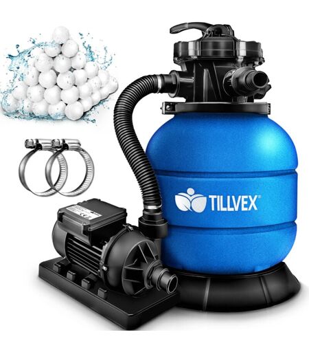 Système de filtration à sable tillvex pour piscines, 7900 l/h, 400 g de billes filtrantes incluses Système de filtration avec vanne 7 voies et adaptateur 2 en 1 (32 mm - 38 mm) Filtre de piscine avec manomètre Filtre à sable pour piscines Système de filtration à sable puissant avec un débit maximal de 7900 l/h pour un dénivelé maximal de 7,5 m. Boîtier de pompe métallique robuste et protection IPX5 contre les projections d'eau. Convient au sable filtrant (sable de quartz), au verre filtrant ou aux billes filtrantes. Avec vanne 7 voies: lavage à contre-courant, filtration, rinçage, vidange, fermeture, recirculation, hivernage (mode veille). Remplissez simplement d'eau et le système de filtration s'auto-amorce. 400 g de balles filtrantes sont également inclus dans la livraison. Manomètre intégré jusqu'à 1 bar, base robuste pour le réservoir de filtration et la pompe, capacité du réservoir jusqu'à 10 kg de sable, vanne 7 voies avec poignée, robinet de vidange, bague de serrage ...