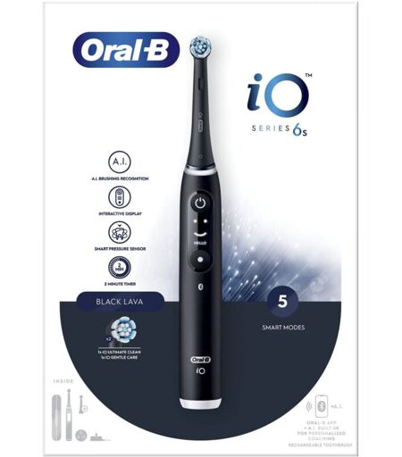 Oral-B iO 6. Utilité: Adulte, Type de brosse à dents: Brosse à dents vibrante, Modes de brossage de dents: Soin quotidien, Nettoyage en profondeur, Soins des gencives, Sensible, Blanchiment. Source d'alimentation: Batterie, Type de batterie: Batterie intégré. Type d'emballage: Boîte. Nombre de poignées fournis: 1 pièce(s), Nombre de têtes de brossage incluses: 2 pièce(s) ...