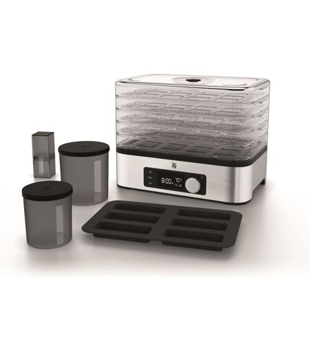 Préparez chez vous des fruits déshydratés, des chips de légumes, des champignons, herbes, et viande séchées et même des barres de céréales. Faciles à préparer, vous pourrez les transporter et les déguster facilement. OPTEZ POUR UNE ALIMENTATION SAINE ET EQUILIBREE ! Profitez chez vous des bienfaits de la déshydratation des aliments : avec le déshydrateur KITCHENminis de WMF, vous pourrez emporter vos préparations saines partout avec vous en préservant leurs vitamines et minéraux. C'est aussi une excellente manière de faire apprécier les fruits et légumes aux enfants ! A l'école, au bureau ou au sport, vous pourrez faire le plein de vitamines avec un en-cas sain et diététique. Le processus de séchage prolonge la conservation des fruits et légumes et réduit le gaspillage. Vous pourrez ainsi déguster vos fruits et légumes préférés, même hors saison. Econome en énergie, le déshydrateur KITCHENminis assure un séchage optimal grâce à une diffusion homogène de la chaleur par circulation d'air électronique. UN APPAREIL ASTUCIEUX ET FACILE À UTILISER Le déshydrateur WMF KITCHENminis est très facile à utiliser : répartissez vos aliments sur les 5 plateaux de séchage en Tritan sans BPA et acier inoxydable et laissez l'appareil s'occuper du reste. Il dispose d'un écran d'affichage LCD qui vous indique la température et le temps restant avant la fin du programme. Un thermostat vous permet de régler la température de 30°C à 70°C selon vos ingrédients et un minuteur peut être programmé de jusqu'à 24 heures. Pour plus de sécurité, l'appareil s'éteint automatiquement une fois le temps écoulé ou en cas de surchauffe. Il est livré avec tous les accessoires dont vous aurez besoin : très pratique, un moule en silicone vous permet de préparer jusqu'à 6 barres de muesli facilement. Pour transporter facilement vos collations, vous retrouverez trois boîtes de rangement de différentes tailles. Un livre de recettes délicieuses est également inclus. UNE PERFORMANCE DE TAILLE DANS UN DESIGN COMPACT ET ÉLÉGANT Fabriqué en Cromargan® mat, acier inoxydable 18/10 de haute qualité, marque déposée et exclusive WMF, sa finition chromée mate saura vous séduire. Compact avec une taille de seulement 277 X 188 X 204 mm, ce déshydrateur occupe une place optimale dans votre cuisine. Tout aussi discret durant son fonctionnement , il est très silencieux et ne perturbera pas vos activités. Imaginée pour les petits foyers, la gamme KITCHENminis de WMF propose des appareils au design compact et assure économies d'espace et de ressource, mais aussi d'énergie grâce à une consommation optimale sans compromis sur les performances. EXPERT CULINAIRE DEPUIS PLUS DE 160 ANS N°1 des articles culinaires en Allemagne, cela fait plus de 160 ans que WMF accompagne les gourmets dans leur quotidien. WMF propose le meilleur de la technologie culinaire allemande, avec des produits d'une qualité supérieure, à la fonctionnalité exceptionnelle et d'une grande élégance. De la préparation à la cuisson, en passant... ...