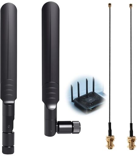 Dual-band WiFi Antenna: 2.4GHz (2400-2485MHz), 5GHz/5.8GHz (5150-5850MHz); Gain: 8dBi; Direction: Omnidirectional;.Omni-Directional Wifi Antenna: This 8dBi omnidirectional antenna is dual band 2.4GHz and 5.8GHz, high gain and can extend the wireless range to dead center.Works With: This wireless antenna works with most wireless devices, such as Mini PCIe Wireless Card Router / Repeater / Range Extender / Desktop PC / Mini ITX Build / PCI Card / FPV UAV Drone / PS4 Build. HOT NOTICE!!! : This wireless router antenna is only used for MINI PCI-E interface, do not use for M.2 (NGFF) interface, please check your connectors before purchasing.Stable Signal Transfer: The WIFI antenna is used on a high quality PCB which guarantees maximum and stable signal quality. Easy to install and increase signal strength.Package includes: 2x 8dBi WiFi antenna + 2x 21cm U.FL/IPEX female pigtail cable to RP-SMA ...