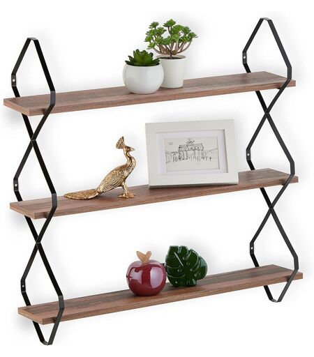 Wall decor: wall shelf as a great decoration for hallway, kitchen, living room, bedroom.Design: MDF wall bracket, brown wood look and black iron, trendy industrial style.Details: Total dimensions (H x W x D): approx. 60 x 60 x 18.5 cm. Each level WxD: approx. 60 x 12 cm.Ingenious: Give your walls a second life with this wall shelf - mounting hardware included.Versatile: Wall mount for decorative objects, photos or plants, storing books, CDs, etc ...