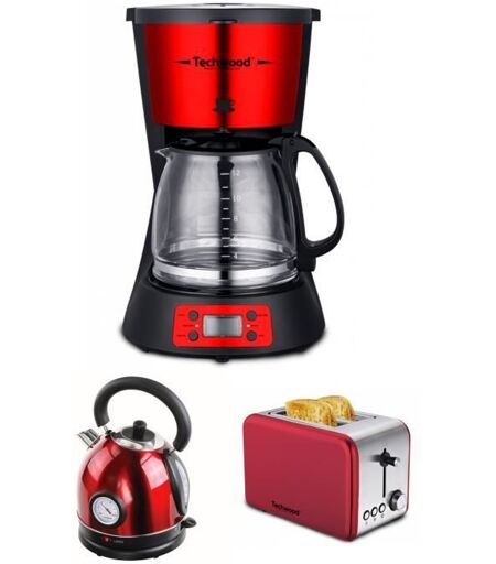 Techwood PACK DEJEUNER Cafetière Machine à café Programmable Inox Rouge 1.5L 1000W + Grille-pain Inox Rouge 2 Fentes 1000W + Bouilloire Rouge