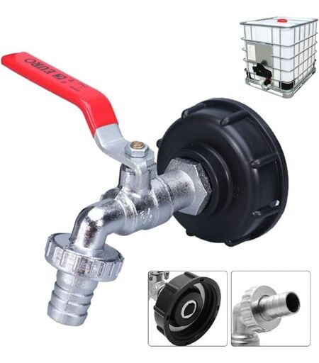 Le robinet est résistant au gel, car le robinet récupérateur d'eau et le bec sont en alliage et la bague de fixation noire est en plastique. L'alimentation en eau peut être coupée rapidement à l'aide d'un long levier en acier, idéal comme robinet extérieur pour arroser le jardin. Le robinet est vissé séparément et peut être remplacé si nécessaire. Entre le filetage extérieur en métal et le filetage intérieur en plastique, l'étanchéité professionnelle est normalement réalisée avec du ruban d'étanchéité pour filetage. Le sens du filetage doit être respecté. Il s'adaptera à la plupart des conteneurs IBC britanniques et européens standard où le filetage de support est un filetage grossier S60X6. Description du produit Spécifications : Matériau : Alliage + plastique PP avec bague d'étanchéité Modèle : Adaptateur de réservoir d'eau IBC Thème : S60x6 Fil grossier importé, 60 mm. Raccordement du robinet : 1/2" Convient pour : réservoir de stockage IBC Entrée : 60 mm (2 pouces) Sortie à ...