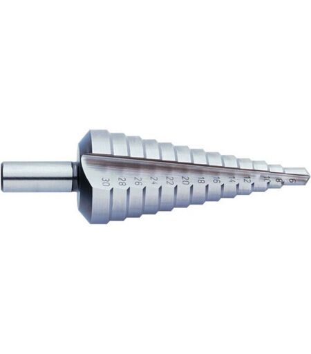 Foret étagé universel, goujure droite, surface sans revêtement Longueur de l'étage : 5 mm, Longueur totale 80 mm, Ø de la queue h8 : 6 mm - Acier à coupe rapide - Diamètre marqué dans la rainure au laser - 2 arêtes de coupe - Brise-arêtes - Goujure droite - Une queue à 3 faces empêche un patinage de l'outil dans le mandrin - Affûtage en croix Remarque : pour prolonger la durée de vie, nous vous recommandons d'utiliser de la pâte de forage (réf. 42 12004 200). ...