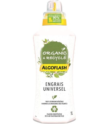Engrais liquide adapté pour la fertilisation de toutes les plantes. Favorise la croissance des végétaux, la floraison généreuse des fleurs et des récoltes de qualité au potager Facile à utiliser avec son bouchon doseur et les doses d¿emploi indiquées au dos du produit. Agiter avant usage, remplir le bouchon jusqu¿au niveau 1, verser dans 1 L d¿eau, fertiliser en arrosant 1 à 2 fois par semaine de mars à octobre et 1 fois par mois de novembre à février. 100% d'origine végétale, Utilisable en Agriculture Biologique* et 100 % Vegan, composé uniquement de vinasse de betterave. ENGRAIS NF U 42-011 NK 3.5,2 Flacon à partir de 90% de plastique recyclé Contenu : 1 x ALGOFLASH Organic & Recyclé Engrais Liquide Universel UAB*, Volume: 1 L, Dimensions (L x P x H): 9,2 x 7,8 x 28 cm, ALIRECY1.La livraison depuis la France est prévue dans 5 jours ouvrés, n'hésitez pas à passer votre commande ...