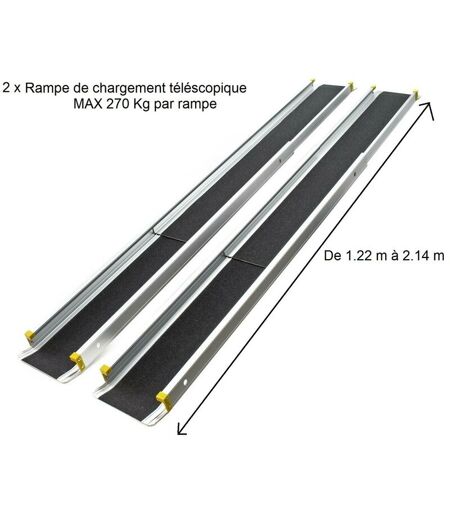 #Description# Lot de 2 rampes de chargement télescopique permet de charger facilement une moto, quad ou autres objets ne dépassant pas 270 kg par rampes La rampe stable est en aluminium de haute qualité. Grâce au matériau, la rampe n'est pas seulement robuste, mais aussi légère et peut être transportée sans problème. Un autre avantage est leur capacité de télescopage. Cela signifie que la rampe peut être repliée et rangée dans un minimum d'espace. Grâce à l'extensibilité de la rampe, sa longueur varie de 121,5 cm à 213,5 cm. La surface antidérapante assure une bonne adhérence sur la rampe. Pour une utilisation encore plus sûre, la rampe dispose d'une élévation latérale. Avec une capacité de charge maximale de 270 kg, la rampe peut être utilisée pour charger des motos, des fauteuils roulants et d'autres charges lourdes et volumineuses. Par exemple, la rampe repliable est également adaptée au transport de machines de construction. Poids : 8.6 kg ...