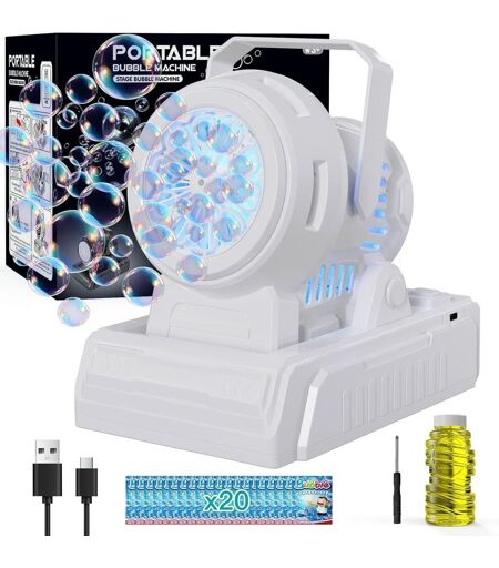 [Adjustable Angle Bubble Machine] The automatic bubble machine is designed with adjustable angle, it can be adjusted 45° up and down for different occasions, bubbles blow faster, higher and farther in the air even without wind, captivating children and entertaining loving pets in the bubble game, also elevating the fantastic decoration for parties, birthdays, weddings, stage performances or other events Outdoor.[High Efficiency 20000+ Big Bubbles] Featuring a powerful motor and 10 large bubble holes, the bubble machine can automatically produce more than 20000+ large colored bubbles per minute. Tons of big bubbles turn the backyard of the garden into a children's playground full of laughter. Comes with 120ml bubble solution and 20 packs of refills to create and enjoy a fun bubble world, making outdoor play time more enjoyable.[Dazzling Lights, Portable Handle] Built-in lights make the bubbles more sparkling and visible even in the dark, making the night party more attractive. The lightweight design and portable handle allow kids to carry it anywhere in the garden, yard or park. Just press a button to bubble and have fun.[Dual Power Supply, Eco-friendly Materials] The electric bubble machine can be powered by 4xAA batteries (not included) or USB cable (included) to connect to an adapter/power bank. The flexibility of the battery or USB cable allows for indoor or outdoor use. The bubble machine uses sturdy materials, smooth surface without sharp edges, which allows children to play with peace of mind.[Bubble Toys for All Scenes] - Kids of all ages love bubbles, the bubble machine allows children to have fun for hours, it is also an essential element to create a pleasant atmosphere in outdoor parks, birthday parties, weddings, patios, gardens, campsites, pool games, etc. An automatic bubble machine is an ideal gift for your children.Warning:Not suitable for children under 36 months.Warning:Toy inside. Adult supervision recommended ...