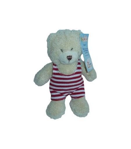 Doudou peluche ours 23 cm environ, écru salopette rayures blanc rouge. Etat : Neuf ...