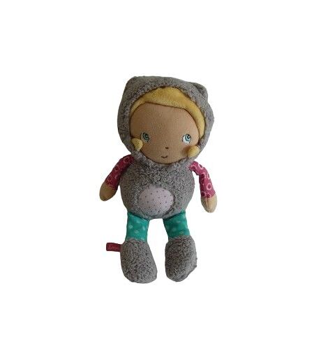 Doudou peluche poupée 27 cm environ, gris jaune vert motifs, capuche amovible. Etat : Très bon état petit trou raccommodé au dessus d'un ?il ...