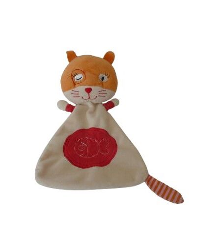 Doudou chat plat 26 cm environ, orange écru rouge motif poisson. Etat : Comme neuf ...