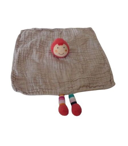 Doudou poupée plat 26x26 cm environ, matière lange beige rouge jambes multicolores. Etat : Comme neuf ...